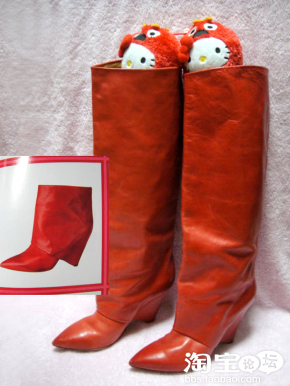 鞋跟10厘米,意大利制,2010年秋冬走秀款,以忍者作为设计理念的此款大红色忍者靴是本季最具创造力的设计,倒三角形鞋跟与尖头的搭配更加突出品牌理念,此款美靴极富想象力的精美设计让爱纱爱不释手,搭配黑色皮毛大衣,本季里最时尚的女人就非你莫属了!爱纱败了18000元