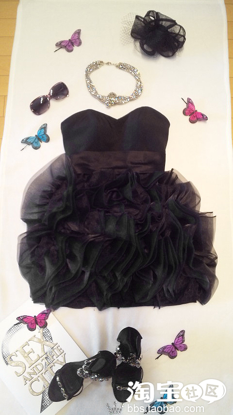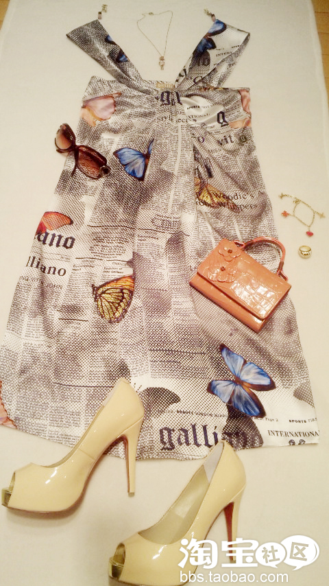 此款John Galliano的2009年走秀款报纸蝴蝶小洋装搭配Christian Louboutin的2009年走秀款鱼嘴凉鞋,一共败了29000元