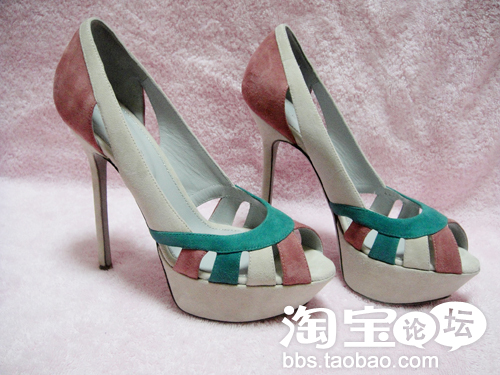 1.左上,品牌ZARA,鞋跟11厘米,西班牙制,2009年春夏走秀款,超亮眼的枚粉色鹿皮款式,超细跟的搭配,尽显脚部曲线,搭配同色系印花连衣裙,尽显小女人风范!爱纱败了1800元