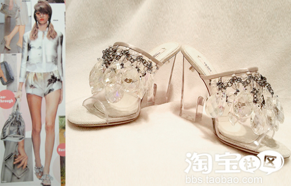 4.右下,品牌PRADA,鞋跟10厘米,意大利制,2010年春夏走秀款,超华丽的施华洛世奇水晶装饰,全透明的露趾凉拖,本季PRADA秀场上的焦点,搭配清凉雪纺连衣裙超级奢华!爱纱败了10800元