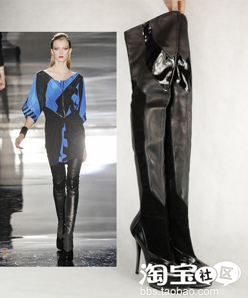 4.品牌GUCCI,鞋跟15厘米,意大利制,2009年秋冬走秀款,夸张的过膝设计,15厘米惊人的超高跟款式,麦当娜和嘎嘎都爱不释手的超长筒美靴,漆皮加小羊皮加鹿皮的三原配皮拼凑款,打造精美几何图案,超贴身的弹力设计更能完美腿部曲线,2009年秋冬秀场上最有人气,时尚名媛纷纷订购的潮款,美靴几乎无法正常走路,不能开车,膝盖不能正常弯曲,几乎就只能站着了!