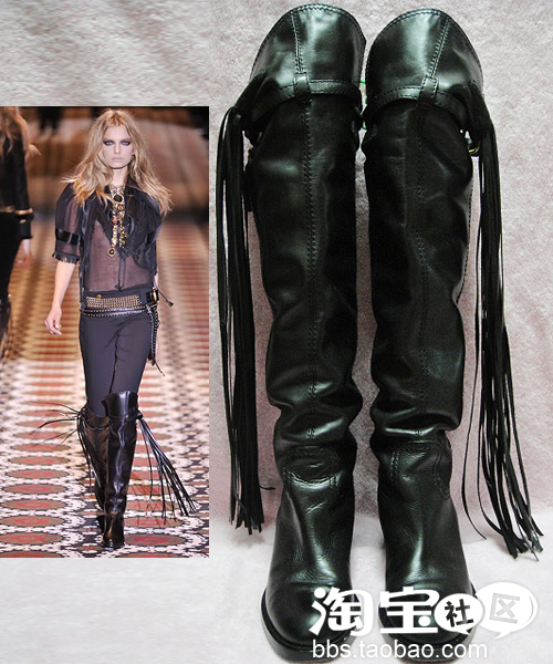 3.品牌GUCCI,鞋跟4厘米,意大利制,2008年秋冬走秀款,所有杂志与时尚名媛讨论的话题,2008年秋冬走秀款的流苏过膝美靴,超赞的此款流苏马靴,高级小羊皮尽心打造,内外以致鞋底全部真皮,个性的后部绑带设计,中性中不失性感,让所有明星名媛为之疯狂!爱纱意大利订购,真的有点舍不得穿在脚上呢!呵呵!爱纱败了24000元