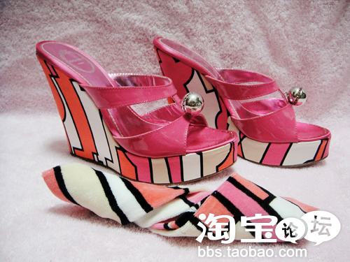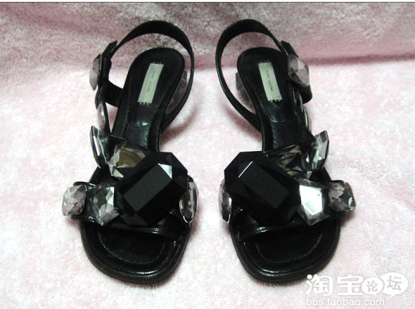 1.左,品牌LV,鞋跟7厘米,意大利制,2007年秋冬走秀款,超可爱品牌标志闪亮装饰水晶花,黑色鹿皮露趾凉拖,简洁清爽,适合搭配黑色小礼服哦!爱纱败了8000元