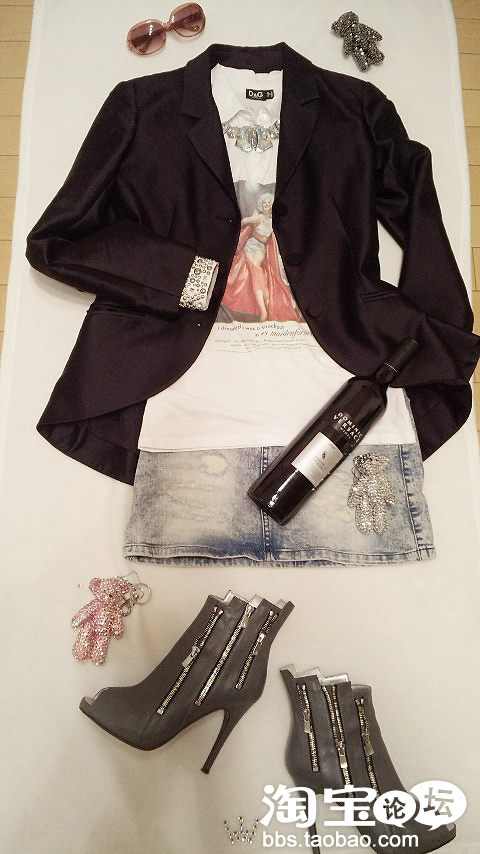 此款Dolce&Gabbana的2010年走秀款T恤加西装小外套搭配同品牌的牛仔超短迷你裙,戴安娜拉链款灰色人气短靴营造唯美气氛,爱纱一共败了17000元