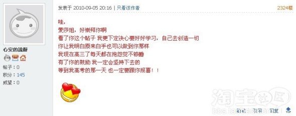 我是爱纱,看了你的留言,我真的很感动!在淘宝上发帖子,精心打造一个梦想的王国,用唯美的图片传递每一份奢华,是想告诉全天下每一个有追求,有梦想的美眉,只要热爱生活,只要愿意去努力,多么平凡的人,也可以拥有属于自己的美丽天堂!感谢妹妹让我明白,爱纱除了奉献华丽的物质之外,还能给予精神上追逐的动力。爱纱想说,炫耀,张扬,拜金,奢华,每一种心情带给我的都只是暂时的快乐!唯有那永存在心底的,最初站在橱窗前仰望那遥不可及奢华时暗下的决心,才是支持爱纱勇往直前的原动力!
