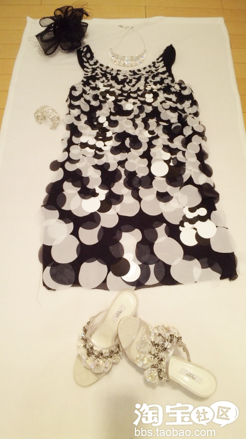 此款VALENTINO的2007年走秀款亮片小洋装搭配2010年走秀款PRADA大颗水晶凉拖,一共败了38000元