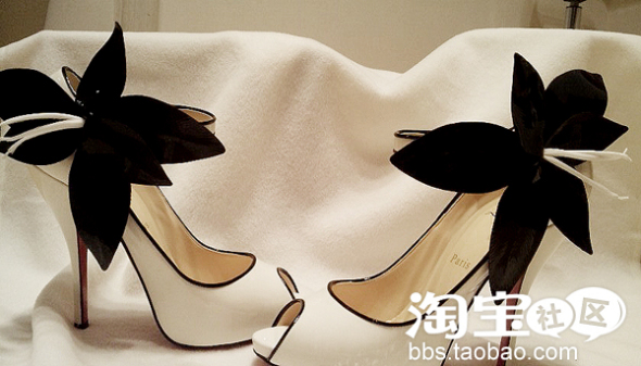 品牌Christian Louboutin,鞋跟12厘米,意大利制,2010年春夏走秀款,简洁的白色鱼嘴鞋搭配黑色镶边,脚腕超夸张的百合花衬托甜美气氛,此款为限量发售,爱纱意大利订购,美鞋不打折,爱纱败了12000元