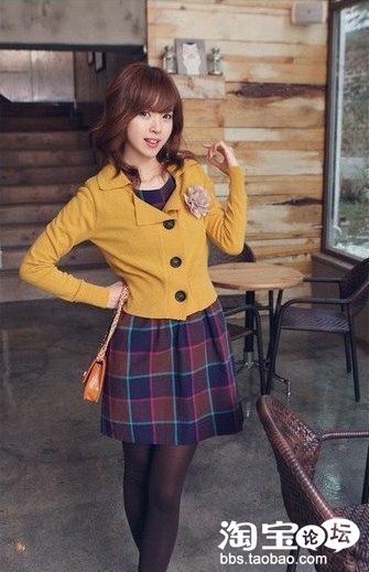 今年秋冬很流行亮色系的黄色,但是有深度的黄色依然有不少的支持者哦,翻领的针织开衫设计很特别,搭配上学院风的格纹连衣裙也很好看哦,针织开衫点缀着浪漫的花多饰物,把优雅的感觉诠释得更加深情。
