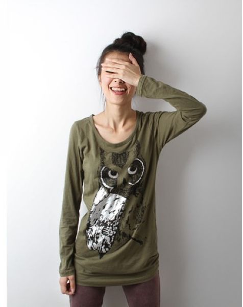 搭配心得:这件墨绿色的长T我配了一条枣红色的铅笔裤和一件短的枣红色的短T,短T是圆领的,所以猫头鹰上端可爱的小角会露出来,感觉衣服穿起来就丰富,腰间配上一条小咖啡色的小腰带,再配上一双黑色的高跟鞋,呵呵,日系卡哇伊!!