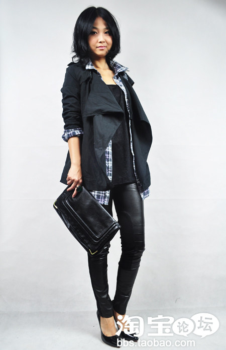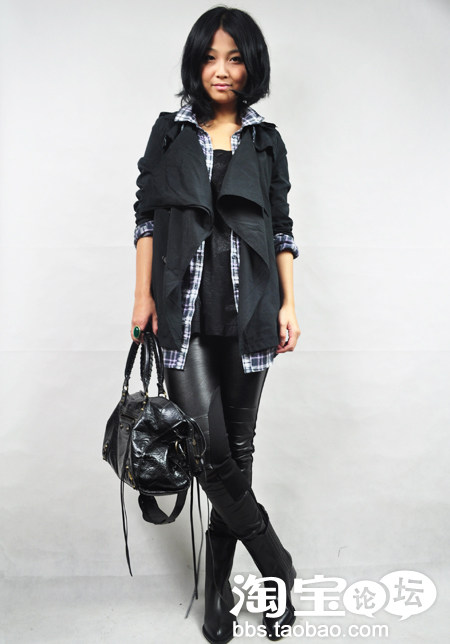 4.不规则领黑风衣+格子衬衫+黑色打底裤+亚历山大王尖头皮鞋