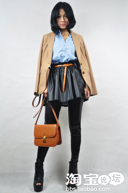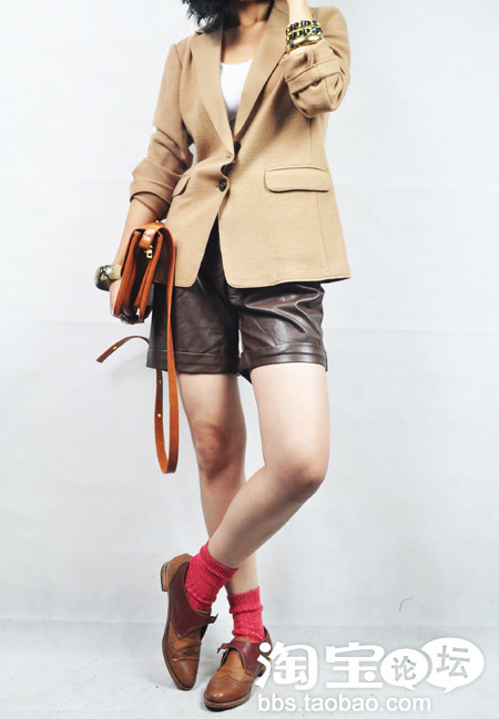 各种颜色的皮短裤是秋冬必备,天气凉的话在里面穿上加厚打底裤,配上雪地靴