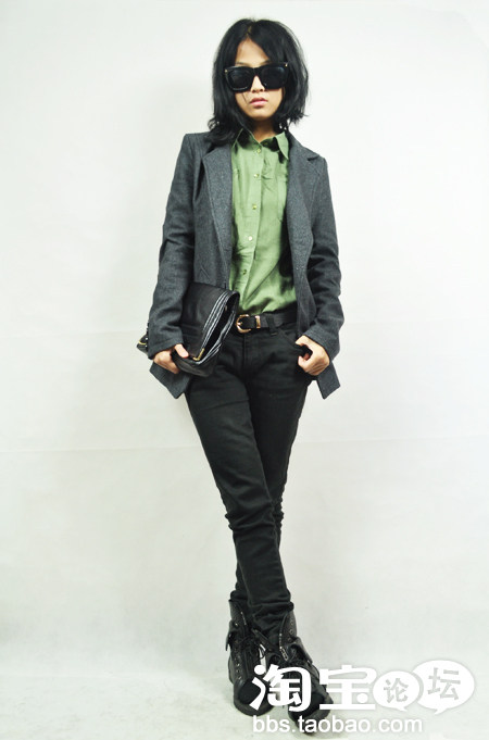 军绿衬衫+灰色呢子西装+黑色牛仔裤+亚历山大王短靴