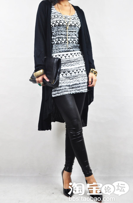 12.T恤+长款针织衫+皮质打底裤/牛仔裤