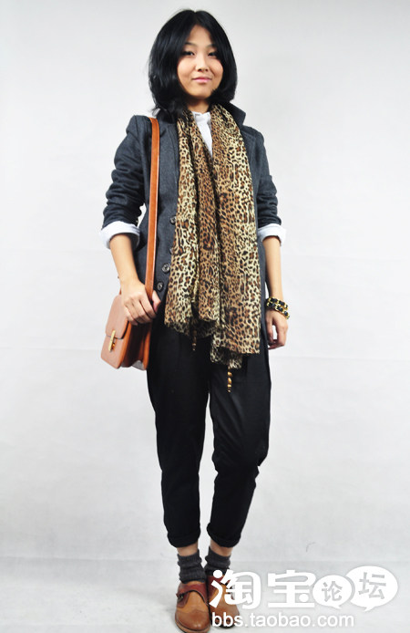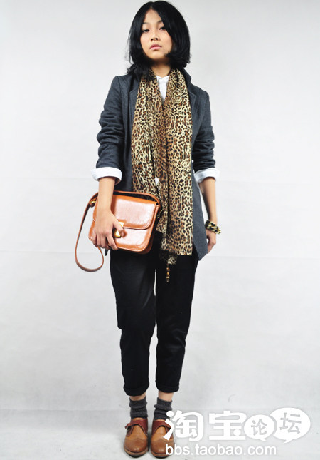 11.灰色呢子西装+白衬衫+豹纹围巾+萝卜裤+英伦皮鞋
