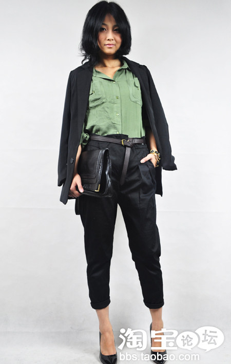 7. 军绿衬衫+黑色西装+黑色高腰萝卜裤+CL基础款尖头高跟鞋