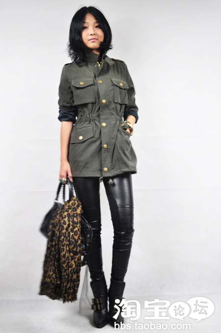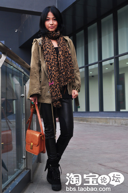 1.改良军装外套+加厚拼皮打底裤+豹纹围巾+机车包+亚历山大王高跟鞋