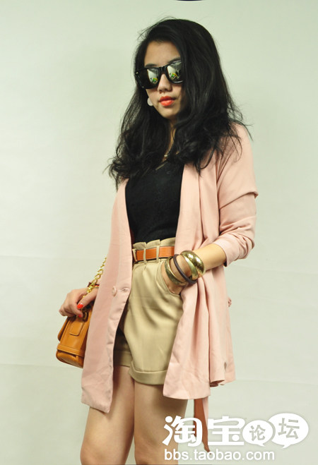 9.肉桂色外套+黑色蕾丝打底衫+驼色高腰短裤+驼色包包/皮带