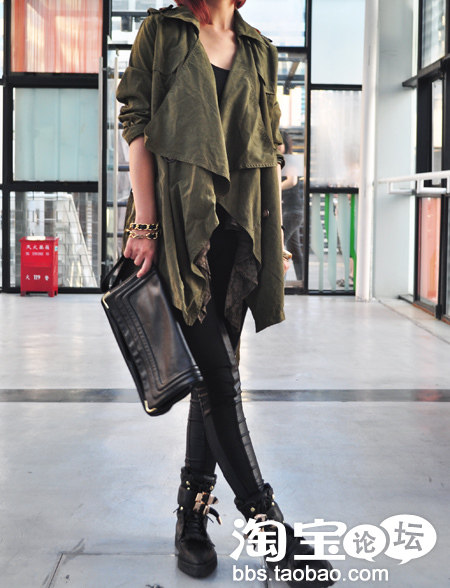 3.军绿风衣+黑色仿皮裤+黑色基础打底+手包