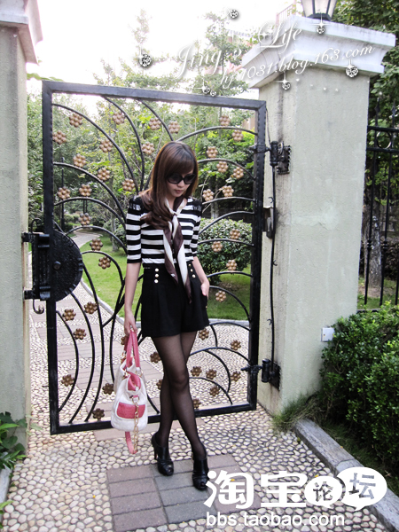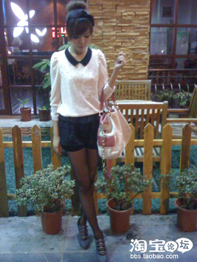 1:中袖雪纺衫+泡泡短裤+丝袜