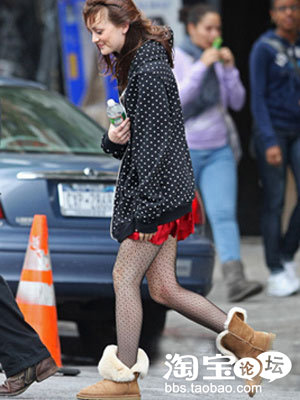 足够爱美的人士都会学习莉顿-梅斯特 (Leighton Meester)的穿丽:首先有一点,只要风度,不要温度;百搭翻毛棕色的短帮雪地靴让她的双腿看起来更加的修长;黑色网眼袜和黑色波点罩衫正好呼应;而红色短裙正好有搭配了黑色的服装调调,对比之下,足够甜美。