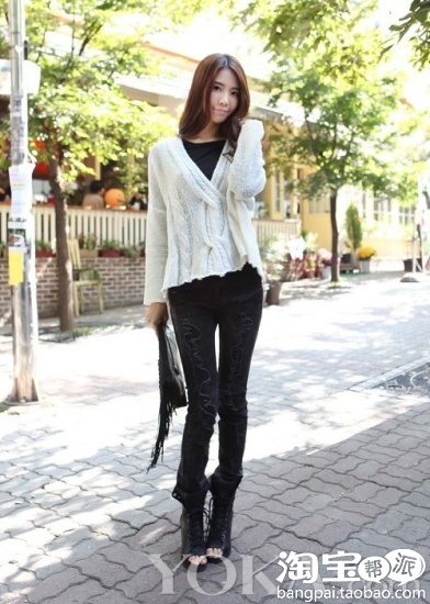 前襟大麻花纹样的针织装饰很显层次感搭上破洞仔裤或漆点仔裤,
