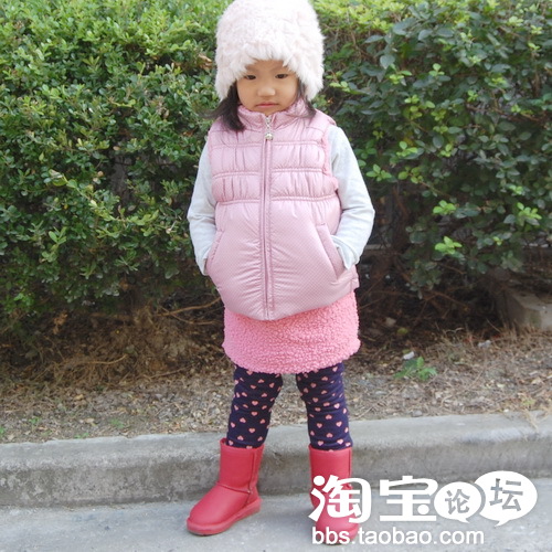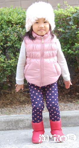 第二套:粉色皮草帽子+粉色棉背心+粉色毛短裙+蓝色心心打底裤+红色雪地靴