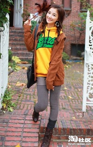 棕色针织外套+黄色图案卫衣,带给MM青春又可爱