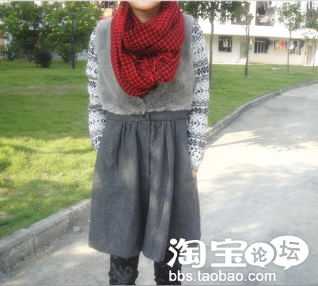 NO,2 雪花长T+胸前兔毛马甲+打底裤+格子围脖