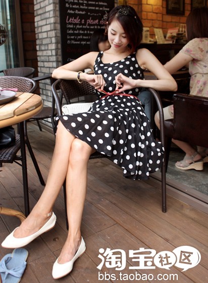 白色时尚素面平底尖头单鞋 + 斑点黑色长裙