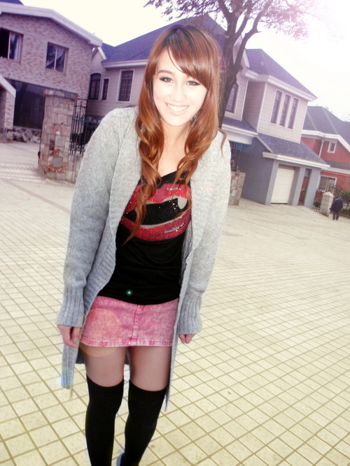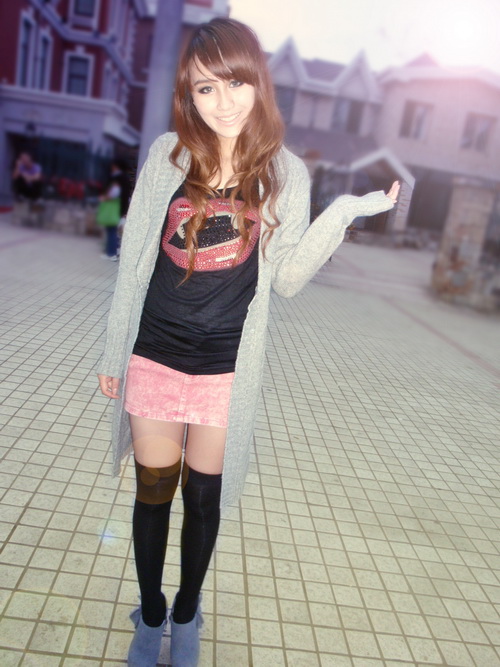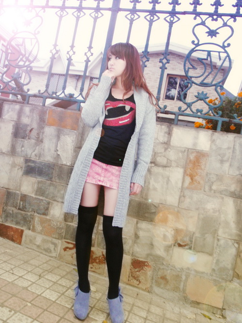 嘴唇T+粉色牛仔裙+风衣款毛衣开衫+过膝袜