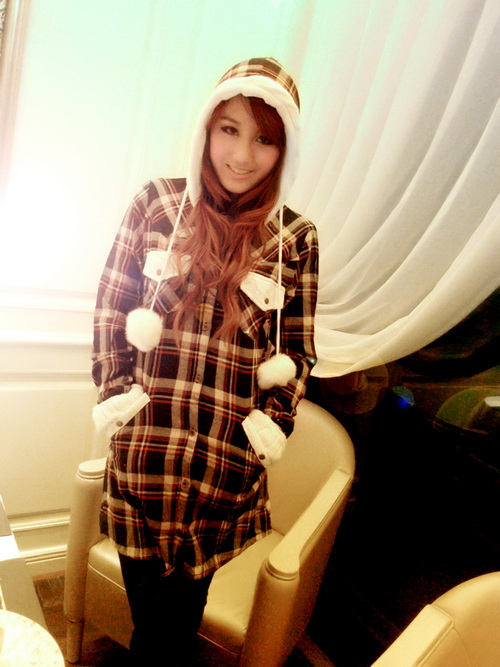 衬衫式的胸前口袋,搭配了连身帽子还有两个大大的白色毛球