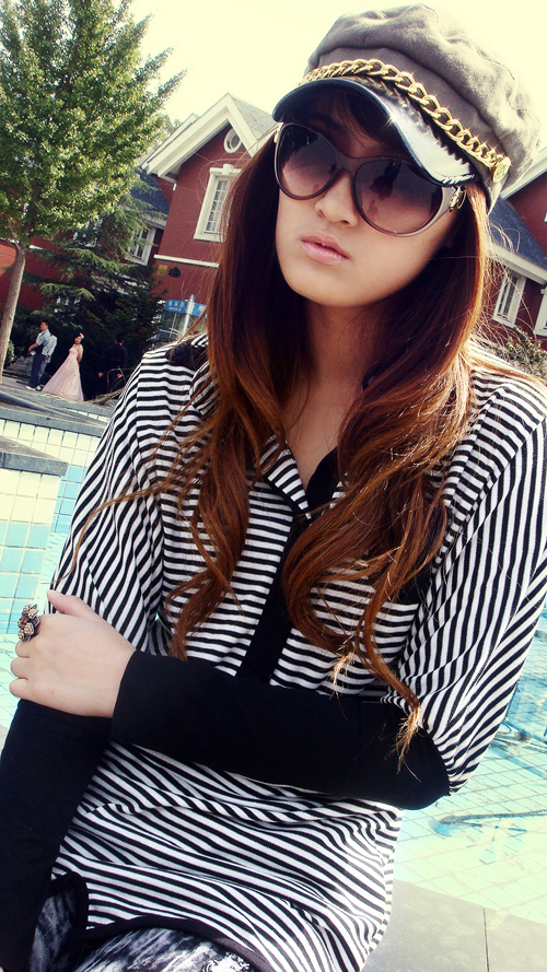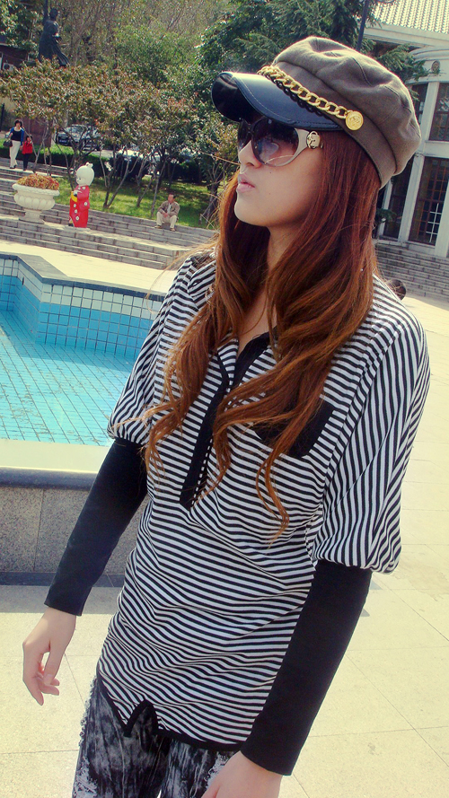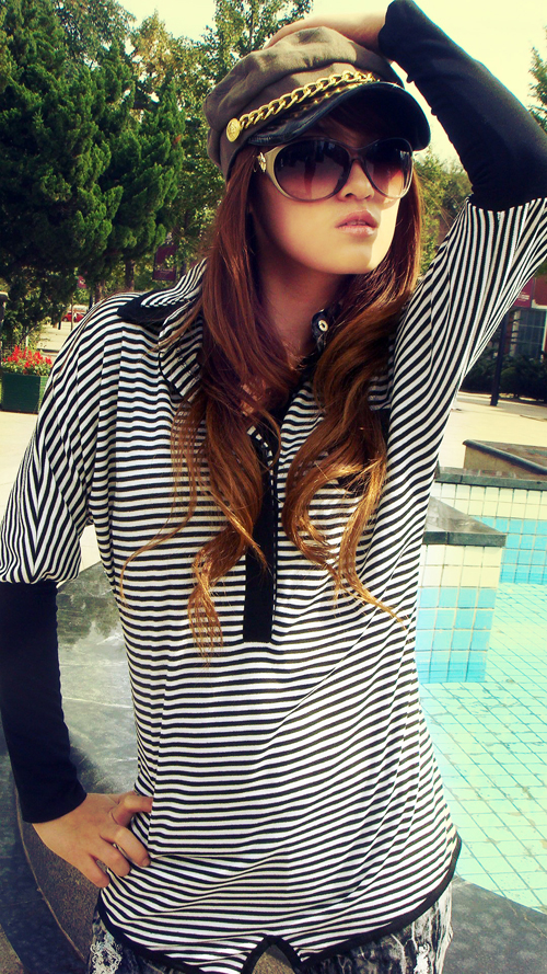 宽松的条纹T恤,下摆不规则的剪裁,随意却时髦,是潮女必备单品