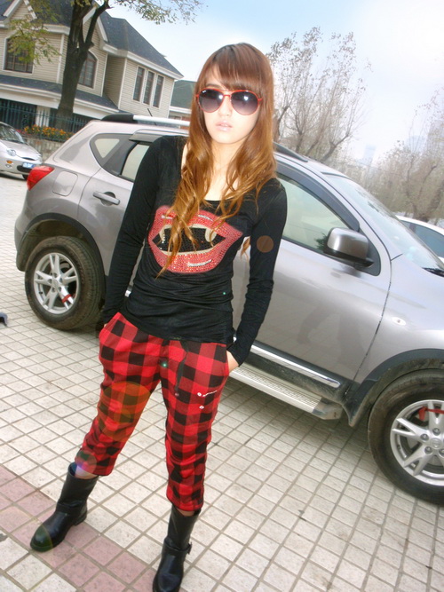 夸张嘴唇T+苏格兰男格子窄脚裤+黑色马靴