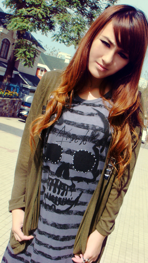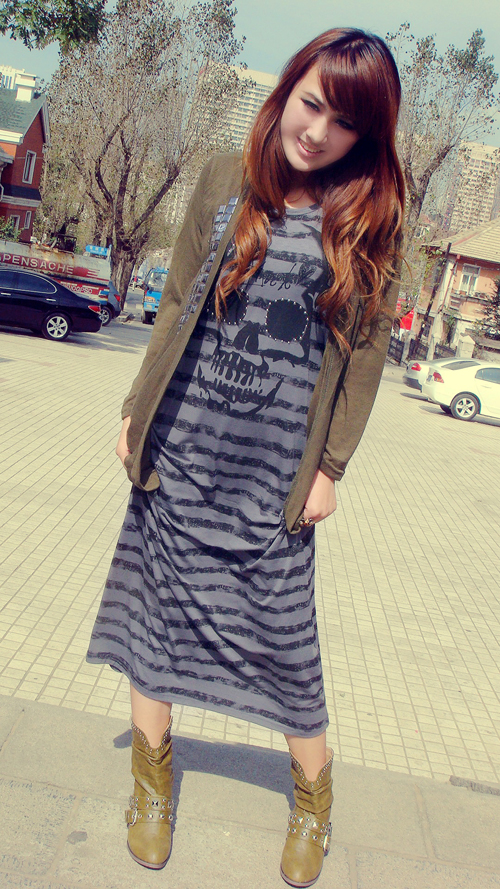 深灰色铆钉拉链长t+彩色骷髅头打底袜