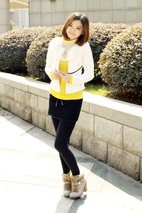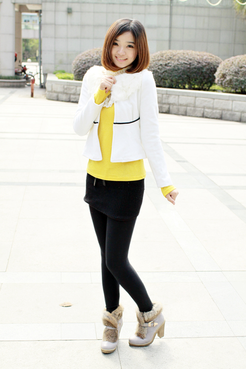 黄色蕾丝中领打底衫+白色兔毛短外套