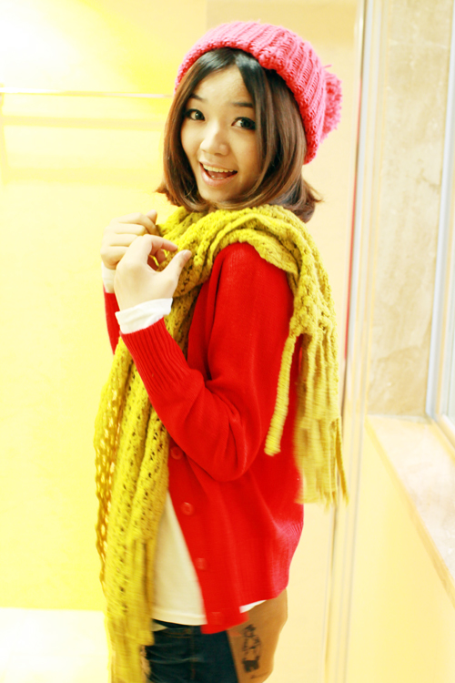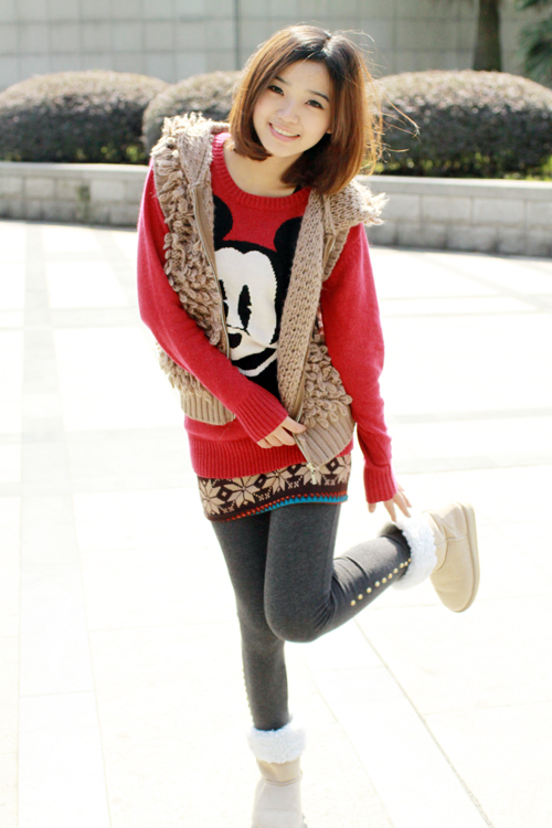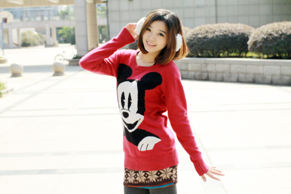 红色PLAY针织衫+可爱米奇T恤+黄色流苏围巾