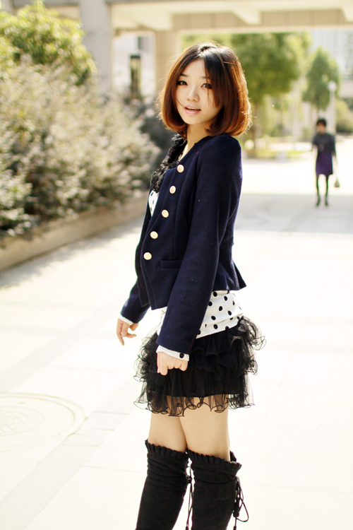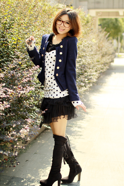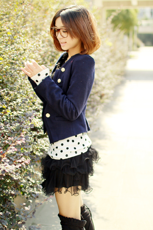 蓝色毛呢外套+黑白圆点T+黑色纱裙