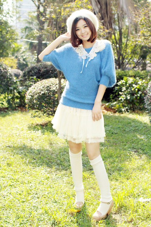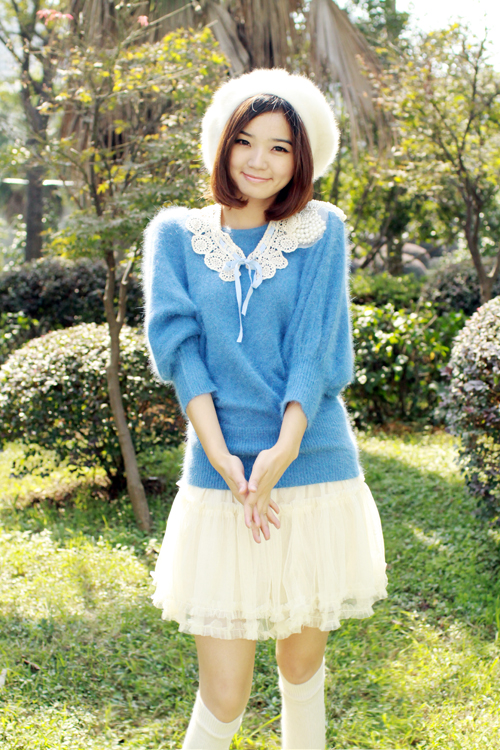 蓝色珍珠蝙蝠袖兔毛套头兔毛衫+白色蕾丝网纱裙+白色蓓蕾帽