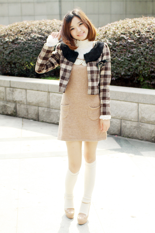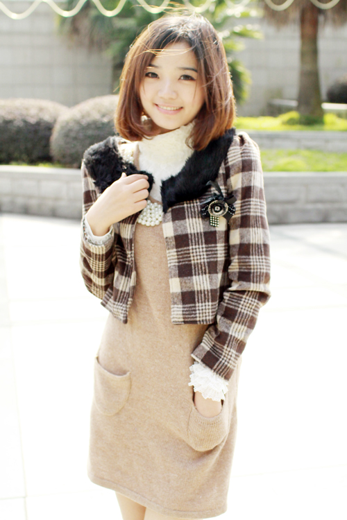 咖啡色格子外套搭配卡其色针织连衣裙,