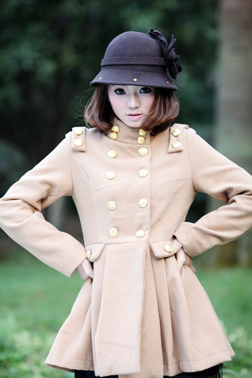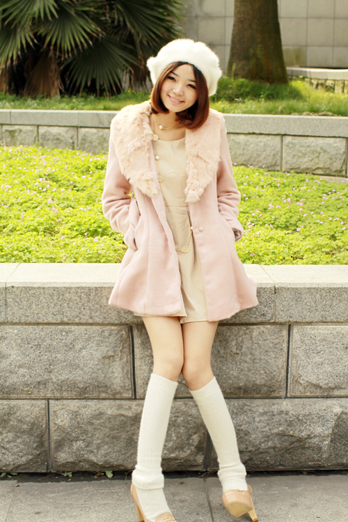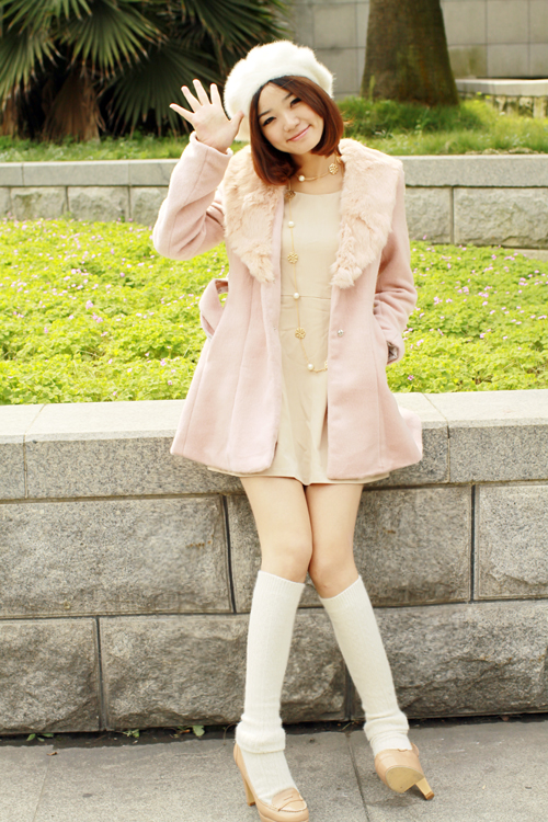 粉红色复古气质兔毛领羊绒大衣+白色袜套
