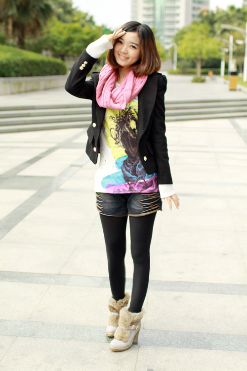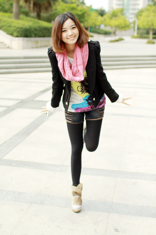 超可爱超甜美的一款百搭外套,很适合小巧的MM穿。里面搭配一款黑色条纹针织衫,