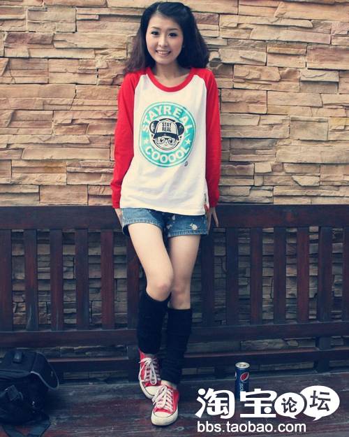 NO.3 STAY REAL阿拉蕾眼镜拼色长t+泼墨牛仔短裤+黑色袜套+红色帆布鞋