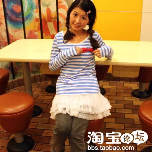NO.4 背后双蝴蝶结蓝色横条纹长t+白色蓬蓬裙+铅笔裤+帆布鞋