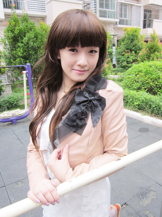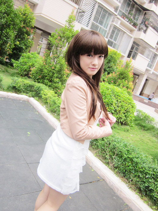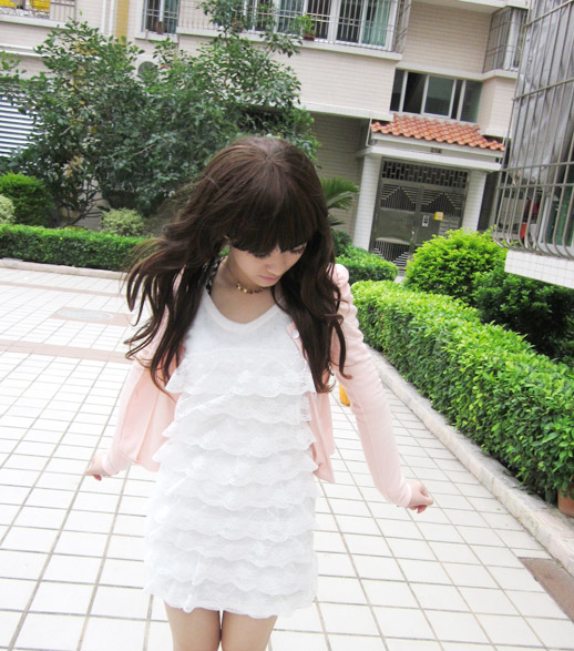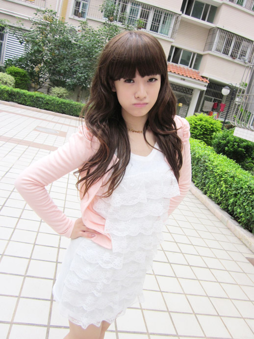 牛乃用了一件修身的耸肩嫩粉小外套搭配雪白蕾丝连衣裙