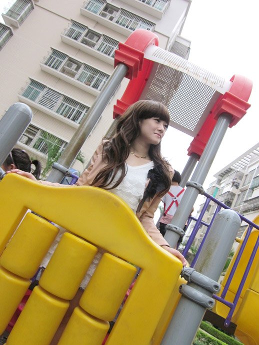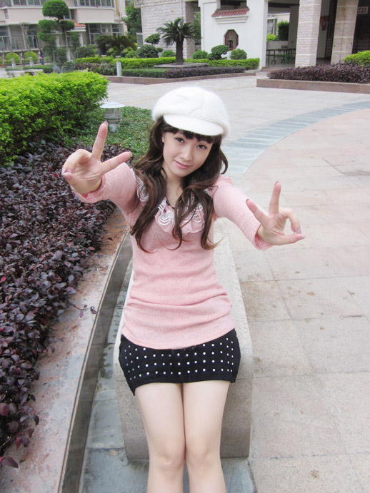 大蕾丝领嫩粉长款T加上2010年流行趋势柳钉短裙和用毛绒绒雪白