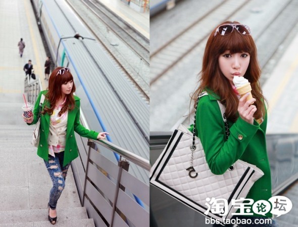 绿色的毛呢外套搭配牛仔铅笔裤,去上班的路上吃个甜甜的冰激凌,