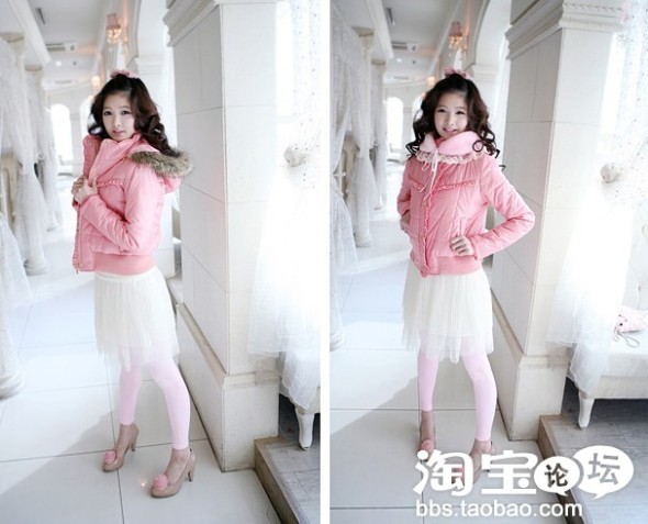 可爱卡哇伊粉色棉衣搭配上白色款短裙,