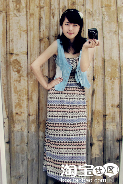 ★13.牛仔马夹长裙+珍珠绢花发箍