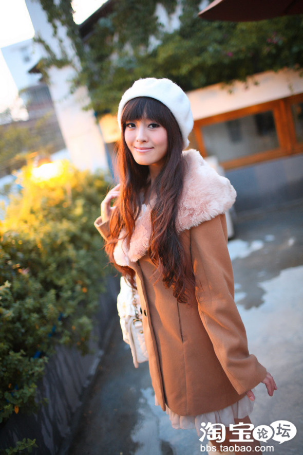 白色贝雷帽+卡其色大衣+百褶裙+雪地靴+白色复古箱包