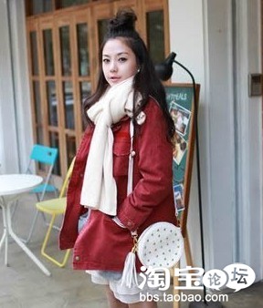 红色的外套,抢眼度十足;配上米白色的围巾,甜美度十足,保暖又不会觉得臃肿;加上迷人的蛋糕裙,让你的甜美气息更加迷人哦!